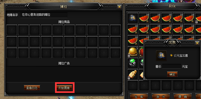 拖动非绑定的道具至摊位界面,弹出出售界面,输入你自己心中的元宝价位,点击确定就放入摊位了,点击开始摆摊按钮即可开张店铺了;