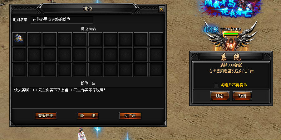 摊位是需要吆喝的,点摊位广告输入文字,点击发广告按钮,每条5000铜币;