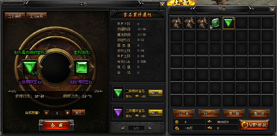 双击背包中的宝石或者拖拽到宝石合成中可合成高级宝石,不同等级的宝石合成数量要求也不同。