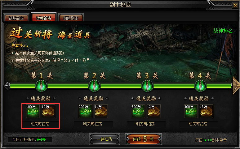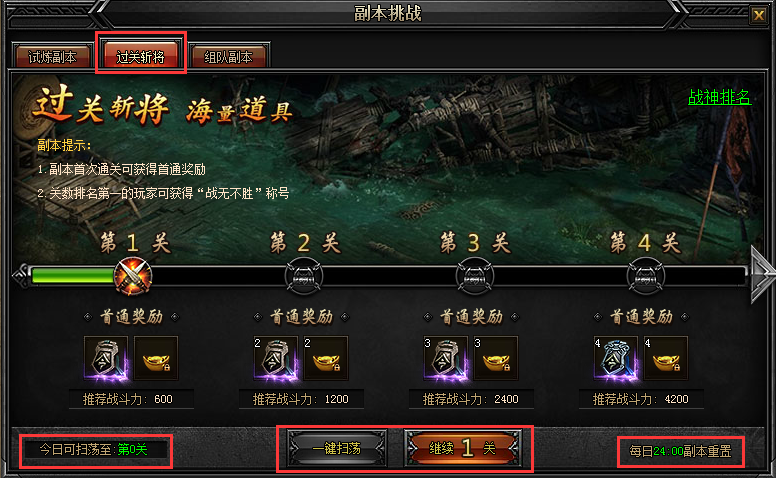 副本每天重置一次,奖励分为首通奖励和扫荡奖励。关卡数排名第一的玩家会获得战无不胜的称号哦。
