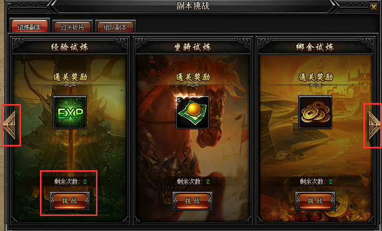 试炼副本有经验、坐骑、绑金等7种资源的副本,挑战成功后会获得大量资源和经验奖励,按左右三角号可切换,每种副本每天可挑战两次。