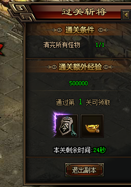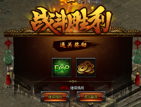 挑战成功额外奖励经验和铜币,玩家可选择继续挑战和退出副本。不做选择会在几秒后自动进入下一个关卡。