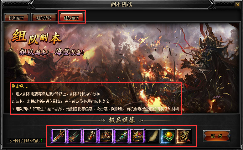 终于可以带着战友一起打副本了,组队副本需要2转以上玩家攻略,时间限制在60分钟。前提需要组队满4人才可进入,且队员要在队长附近。