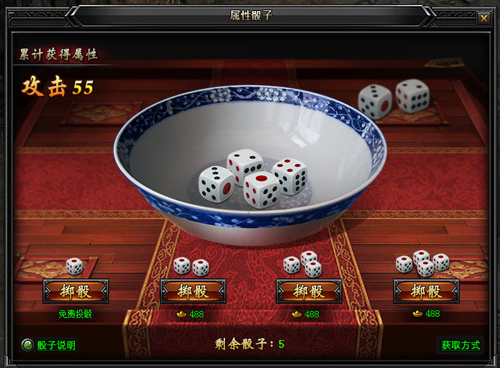 投掷不同数量的骰子,收费的元宝也不同;1个为免费,2个为488元宝,3个为888元宝,4个为1288元宝;