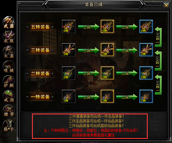 三件1转圣装备可合成1转仙装备。