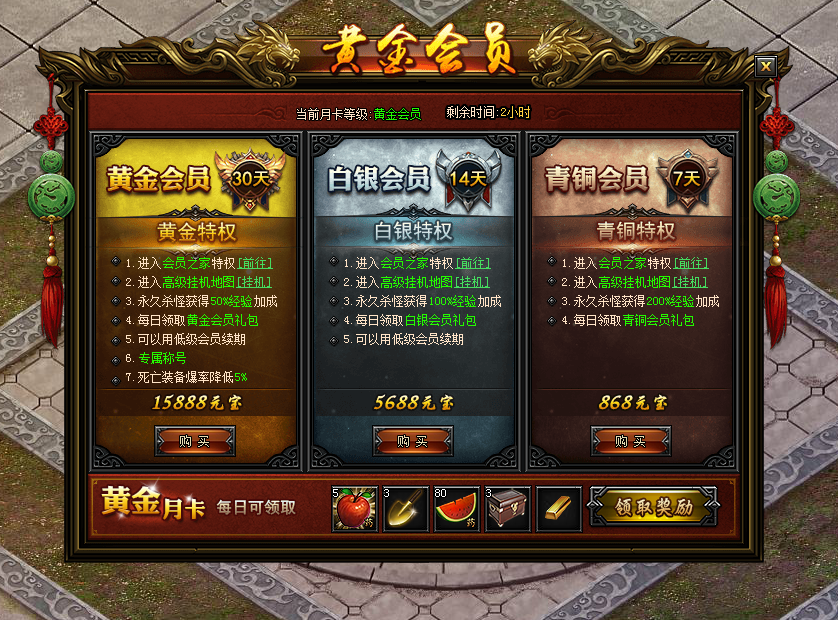 1. 进入会员之家特权 2. 进入高级挂机地图 3. 永久杀怪获得200%经验加成 4. 每日领取黄金会员礼包 5. 可以用低级会员续期 6. 专属称号 7. 死亡装备爆率降低5% | 1. 进入会员之家特权 2. 进入高级挂机地图 3. 永久杀怪获得100%经验 4. 每日领取白银会员礼包 5. 可以用低级会员续期 | 1. 进入会员之家特权 2. 进入高级挂机地图 3. 永久杀怪获得50%经验 4. 每日领取青铜会员礼包 |