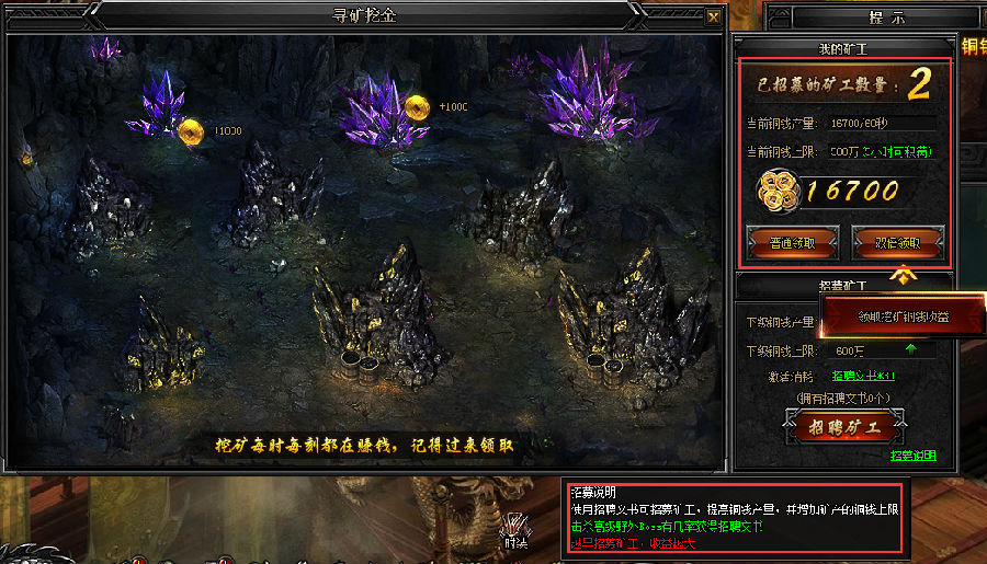 招聘更多的矿工帮玩家挖矿,能大幅提升铜钱产量。招聘矿工需要招聘文书,击杀野外高级BOSS就能获得。越早的开发出越多矿场,收益才越大!