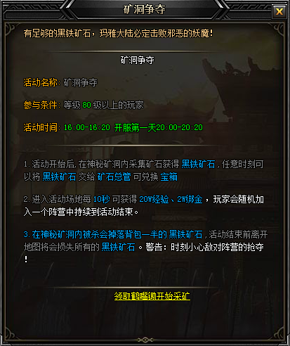 3、矿洞内会刷新黑铁矿石,需要玩家去采集。获得黑铁矿石可以兑换高额奖励和宝箱。
