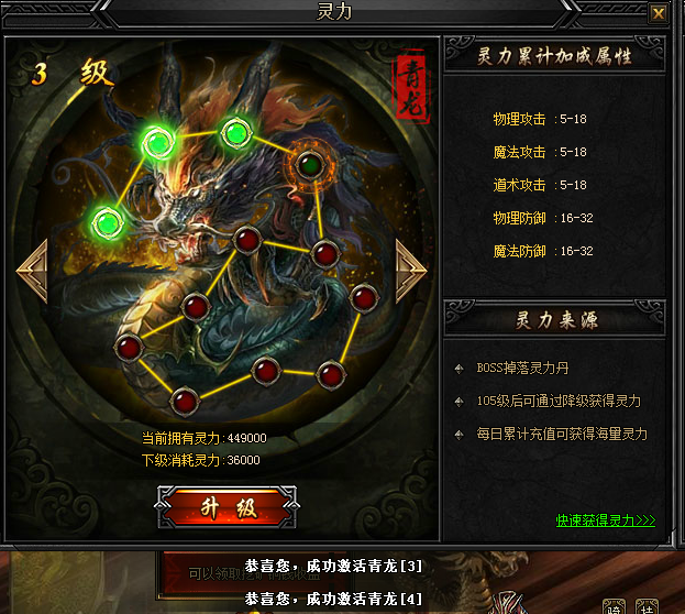 点击升级按钮,消耗灵力,并激活灵穴,激活灵穴可以获得属性加成。