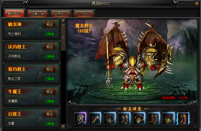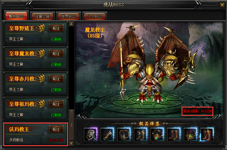 在野外BOSS页面,会显示野外BOSS的刷新时间,玩家也可查询各BOSS的极品掉落物品属性。