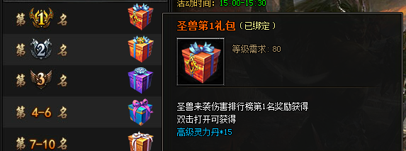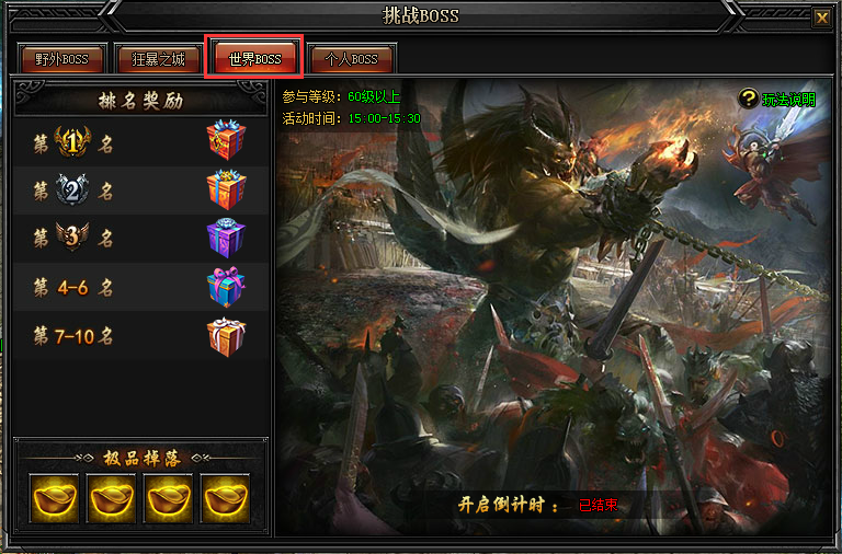 世界BOSS每天15:00-15:30刷新,60级以上玩家都可参与。BOSS会掉落珍贵的元宝奖励,并按照伤害排名,前10名玩家会获得海量灵力丹奖励。