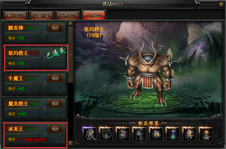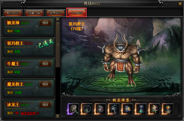 个人BOSS界面内的所有BOSS随着玩家等级的提升逐一解锁。