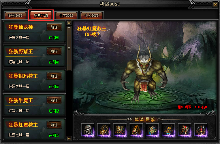狂暴之城页面拥有与野外BOSS一致的信息内容,选择《前往》会传送到狂暴之城入口NPC处。