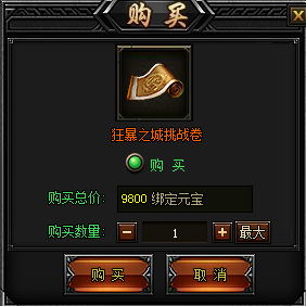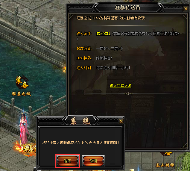 狂暴之城为VIP1以上玩家专属打宝地图,有两层地图,共计12个BOSS。进入地图需要狂暴之城挑战卷,挑战卷可多种方式获得。如果没有挑战卷,可以消耗绑定元宝购买。