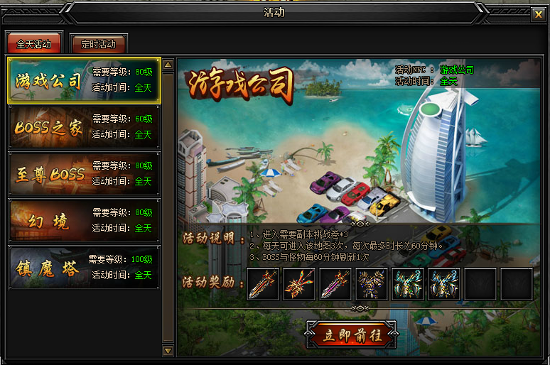 玩家可通过活动界面或游戏公司npc进入副本;VIP1可消耗3个副本挑战卷