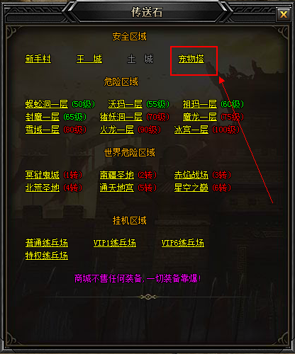 2.通过“宠物塔”NPC,可以传送至“宠物森林”,该地图怪物会掉落大量宠物丹和兽魂结晶等物品