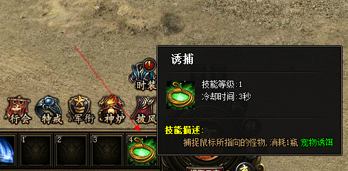 1.当玩家达到25级时,获得新技能“诱捕”,用鼠标指向怪物,按“诱捕”技能后,即可捕捉怪物,捕捉成功消耗一瓶“宠物诱饵”。
