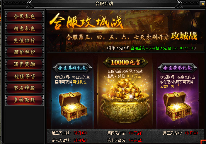 3、皇城回收清零,重新计算攻城天数,合服第3天自动开启首次攻城