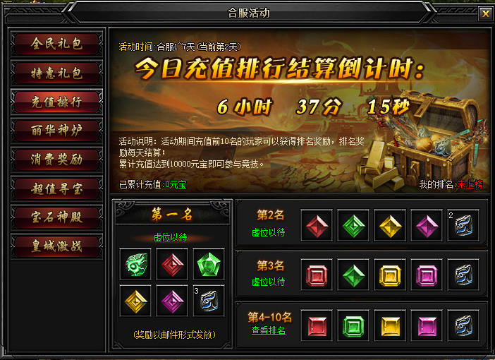 充值达到10000元宝即可上榜参与排名竞技,第一名可获得七级神力宝石等豪华奖励
