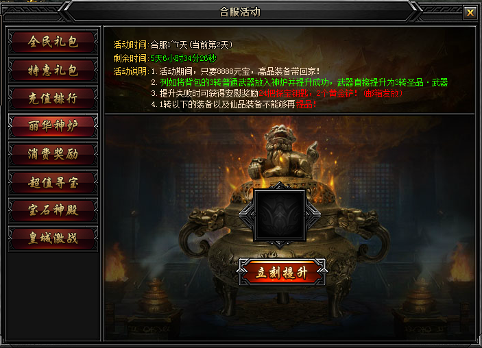 活动期间,高概率将装备进行提品,失败补偿24个寻宝钥匙和2个黄金铲