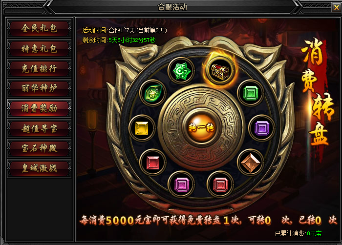 活动期间,消费达5000元宝,即可获得一次转盘机会