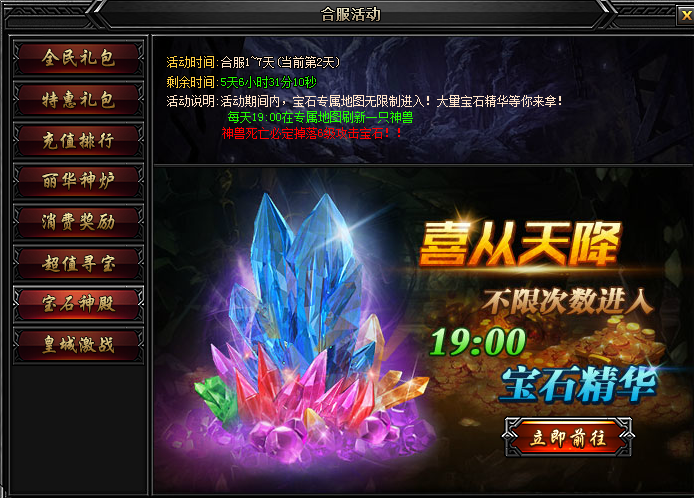 合服专属地图,地图内有4只boss,4小时刷新一次。每天19:00刷新一只神兽,神兽随机掉落6级攻击宝石