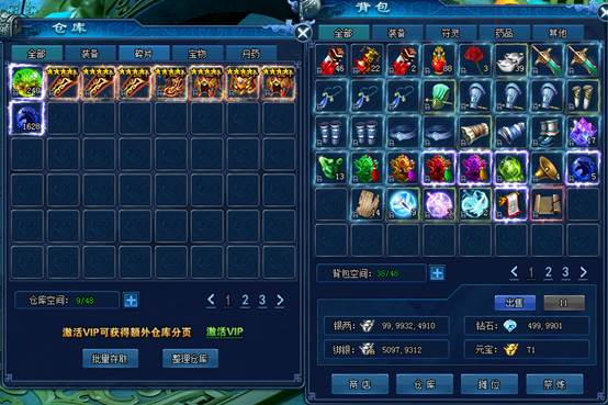 仓库可用于承载玩家不常有的道具和装备,也可以将物品取出放入自身背包内。