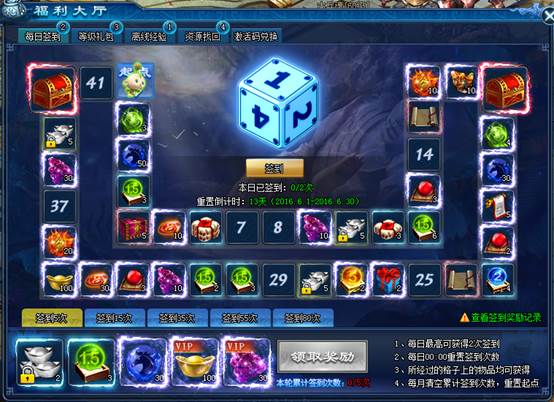 每日签到使用投掷骰子的方式,投掷出的骰子点数,即为可以行走的格子数,经过格子中的物品均可获得,玩家每日最高可获得两次签到。