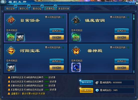 玩家前一天未完成的副本,可在第二天追回该副本的相关经验及奖励。可以选择用银两或是钻石来追回自己未参加或未完成的活动。系统提供“奢华找回”与“至尊找回”两种方式,“奢华找回”是选择用银两找回,只能找回全部70%的资源;“至尊找回”是使用钻石找回,可100%找回所有错过的活动奖励。