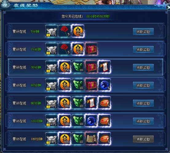每日在线时间长的玩家,可领取随机奖励,更有机会获得珍贵的道具。