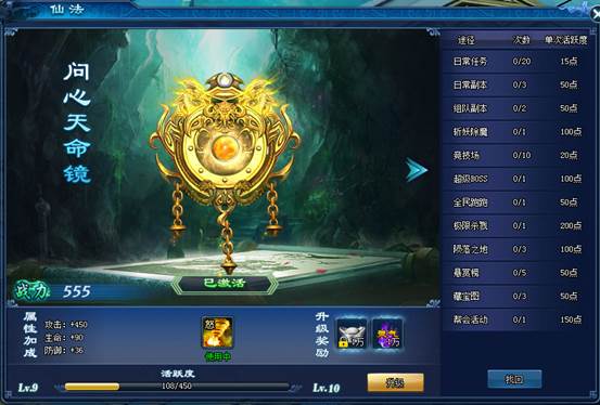 活跃值可用来升级仙法,仙法等级越高,获得的属性加成越高,还可获得额外的道具奖励。