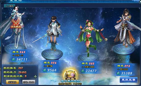 玩家可以在个人竞技场内与排名在自己之前的玩家进行切磋,胜利后可提升排名,每日将根据玩家的切磋排名发放排名奖励。