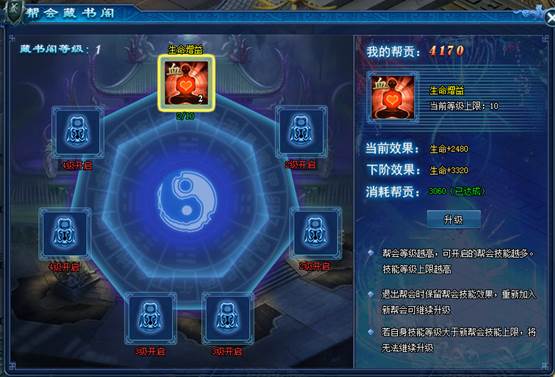 帮会藏金阁是玩家学习和提升帮会技能的地方。玩家通过消耗帮贡,升级帮会技能,提升自身属性。藏经阁建筑等级越高,可开启的帮会技能越多,技能的等级上限也越高。