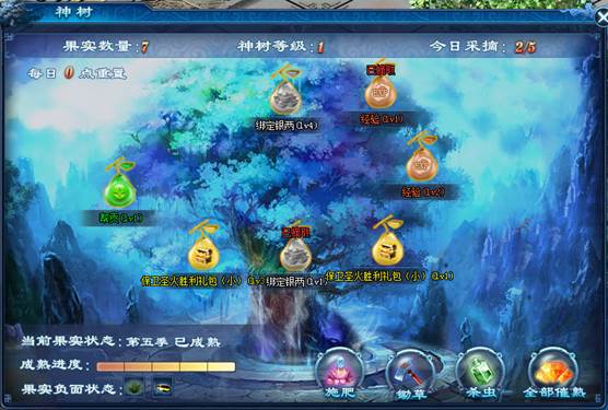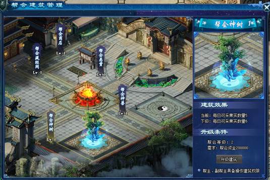帮会神树产出银两、经验、帮贡、礼包果实,神树果实随机生成,摘取果实获得相应的收益玩家在这里可以给果实施肥、除草、杀虫,提升果实收益,帮主、副帮主和堂主还可选择消耗钻石催熟果实,催熟的果实可以立即采摘。