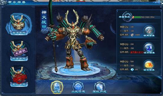 神兽培养分为银两培养、碎片培养、钻石培养三种方式。