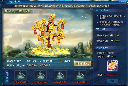 免费获得绑定银两的途径。可使用道具升阶造币殿的等级,其等级越高,绑定银两产量与容量就越高;当造币殿达到一定等级后,可开启高级锻造,制造元宝。