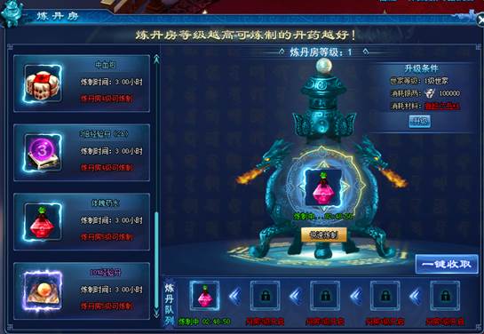免费获得道具的途径。炼丹房等级越高,可炼制的道具越好。