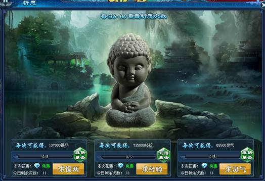 玩家每日有三次免费祈愿的机会,分别可获得经验、灵气、银两。