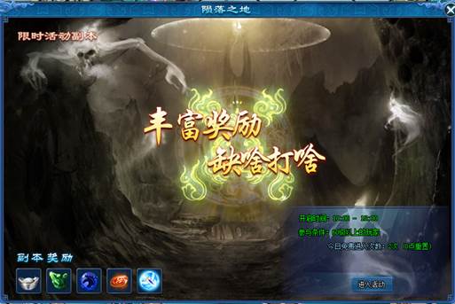 陨落之地为限时活动副本,每天10:00至18:00开启,等级达到60级的玩家可以进入副本中进行挂机,免费获取装备道具和进阶道具。