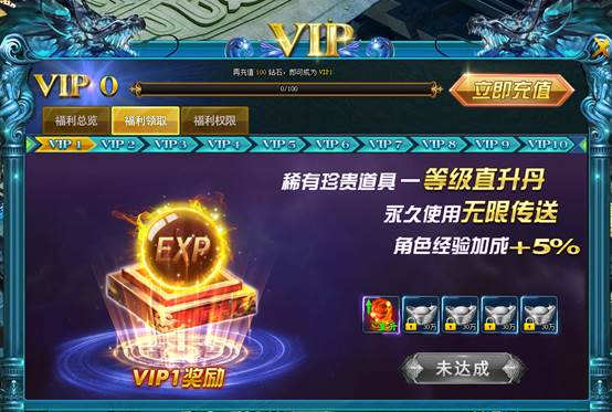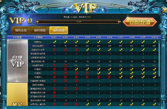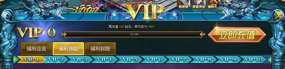 VIP等级为累计充值消费计算,成为VIP之后,根据不同等级,可以通过界面领取与当前VIP等级相符的奖励。